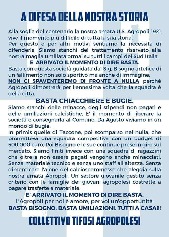 Questo il comunicato diramato dai tifosi dell’Agropoli: