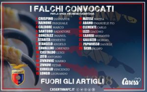 Sono 22 i convocati di Ciro Ginestra per il delicatissimo match contro la Vibonese. Sono quattro i falchetti che non prenderanno parte alla trasferta in terra calabrese. Restano a casa, infatti, gli infortunati Floro Flores, Origlia, Varesanovic e Lame.
