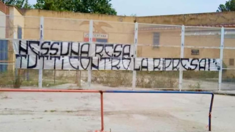 A schierarsi al fianco delle tante tifoserie che sono scese in campo con forza per dire no alla ripresa dei campionati, si è unita anche quella della Casertana. I supporter rossoblù, o meglio, la frangia appartenente ai Fedayn Bronx, hanno palesato il proprio dissenso contro un’eventuale ripresa dei campionati con un chiaro messaggio. La parte più calorosa della tifoseria rossoblù quest’oggi, di fatto, ha esposto uno striscione in città che recita: “Nessuna resa. Tutti contro la ripresa”.