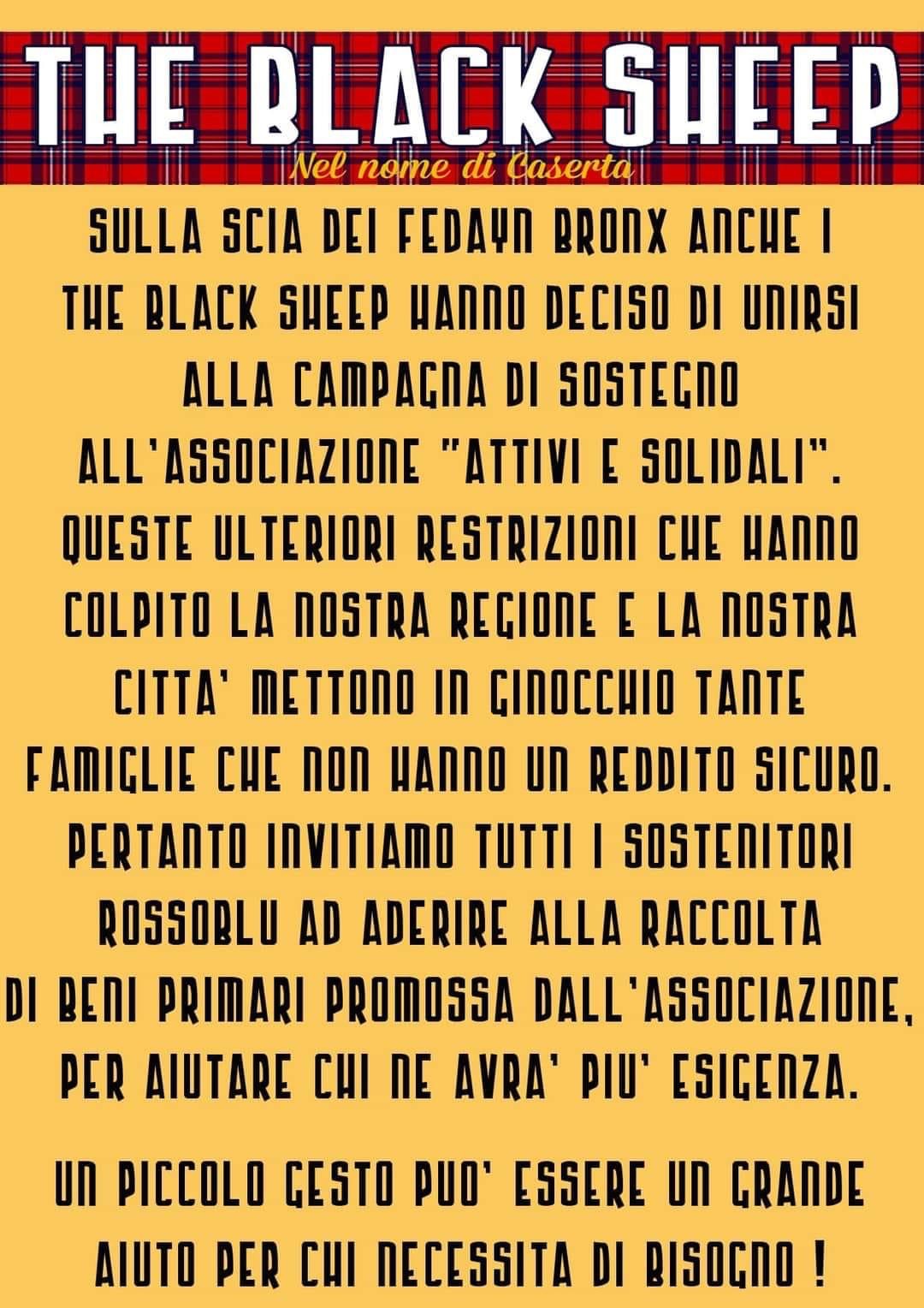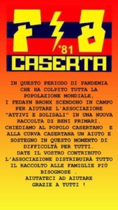 Oltre a mostrare un’amore indissolubile e viscerale per la Casertana, la tifoseria rossoblù ancora una volta si contraddistingue nel sociale prendendo parte ad una splendida iniziativa allestita al fine di aiutare le famiglie meno abbienti in questo periodo di pandemia causato dall’avvento del Covid-19. La frangia di supporter a scendere in campo al fianco delle persone più in difficoltà sono i ‘Fedayn Bronx’ ed i ‘The Black Sheep’.