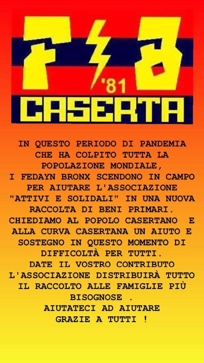 I tifosi della Casertana hanno voluto fortemente dare il proprio contributo in questo momento storico aderendo al progetto dell’Associazione ‘Attivi e Solidali’. Lo scopo della campagna benefica è quello di raccogliere più fondi possibili per la raccolta di beni primari che saranno destinati appunto alle famiglie più in difficoltà della città di Caserta. Gli stessi ‘Fedayn Bronx’ ed i ‘The Black Sheep’ hanno invitato l’intera tifoseria rossoblù a partecipare alla nobile iniziativa per dare maggior sostegno a chi non ha un reddito sicuro. Dunque, non solo la Casertana, i supporter dei falchetti confermano ancora una volta di avere a cuore le sorti dell’intera città.