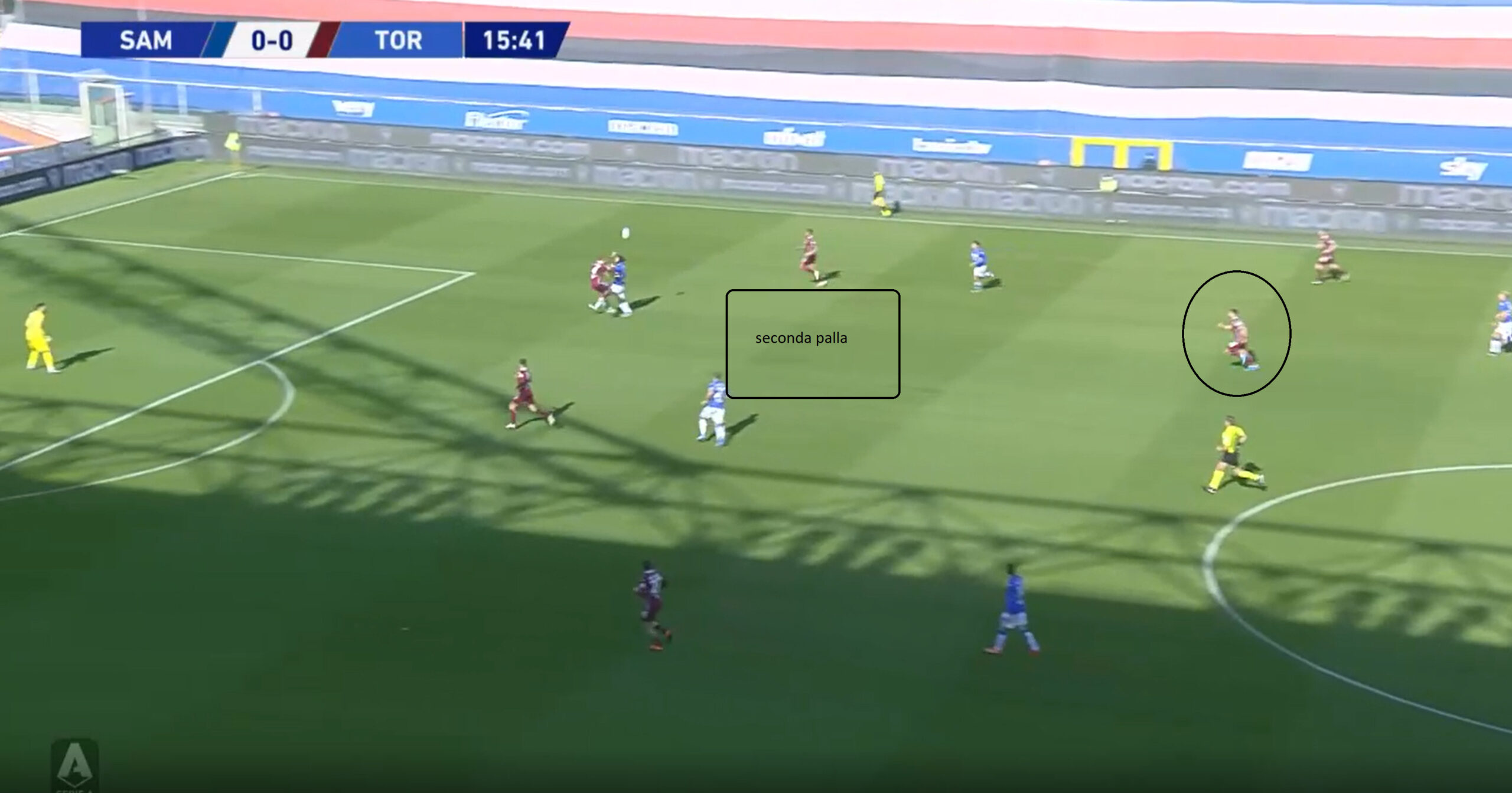 Il vero punto debole dei granata in fase di non possesso è la ricerca della seconda palla, infatti correndo molto in avanti il Torino fatica a correre all’indietro. La Samp ha approfittato di questa pecca e ha spesso alzato la palla saltando il centrocampo, vediamo dall’immagine come la linea di Nicola scappi bene, il centrocampo invece fatica a recuperare lo spazio alle loro spalle; in particolare il mediano Mandragora.
