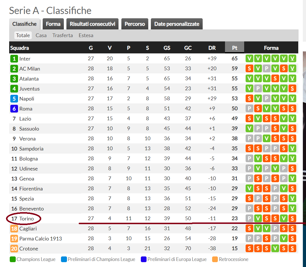 Benvenuti nella rubrica “L’Analisi Tattica” di Sportcampania.it, in vista di Torino – Juventus oggi ci occuperemo di analizzare da un punto di vista sia statistico che tecnico-tattico la sorpresa (in negativo) di questo campionato, i granata del Torino. Partiamo da un’indagine statistica generale, dando uno sguardo per cominciare alla classifica del Toro.