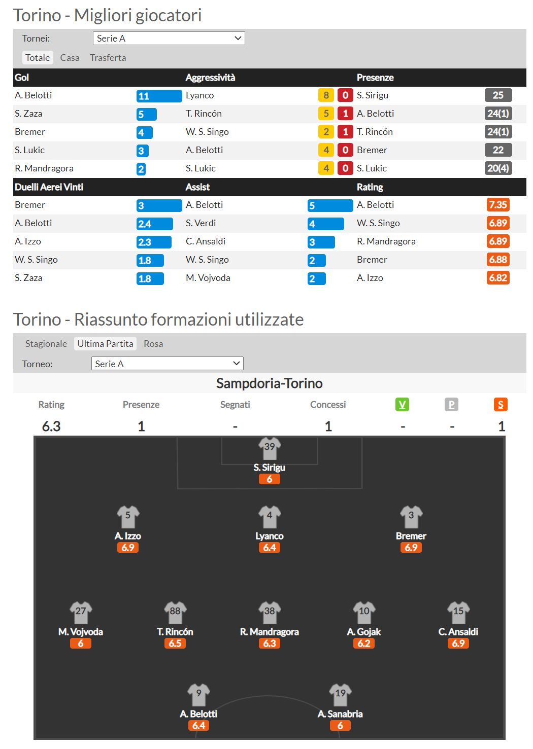Come detto in apertura la rosa del Torino sta disputando un campionato ben al di sotto delle aspettative… tutta colpa degli allenatori passati di lì? Vediamo qualche statistica individuale: