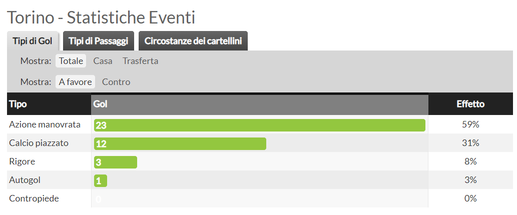 L’impronta che Nicola ha dato alla squadra è quella di un calcio senza dubbio propositivo, vediamo infatti dalla prima immagine come la stragrande maggioranza dei gol arrivino da situazione di azione manovrata, sintomo di ottima fase di possesso. Dalla seconda immagine possiamo capire due cose: il Toro corre molto più in avanti che indietro, infatti la maggior parte dei gol arriva da azione manovrata. Inoltre vediamo come appena due gol subiti siano frutto di ripartenze subite, in seguito vedremo l’ottimo lavoro dei granata per quanto riguarda le coperture preventive.