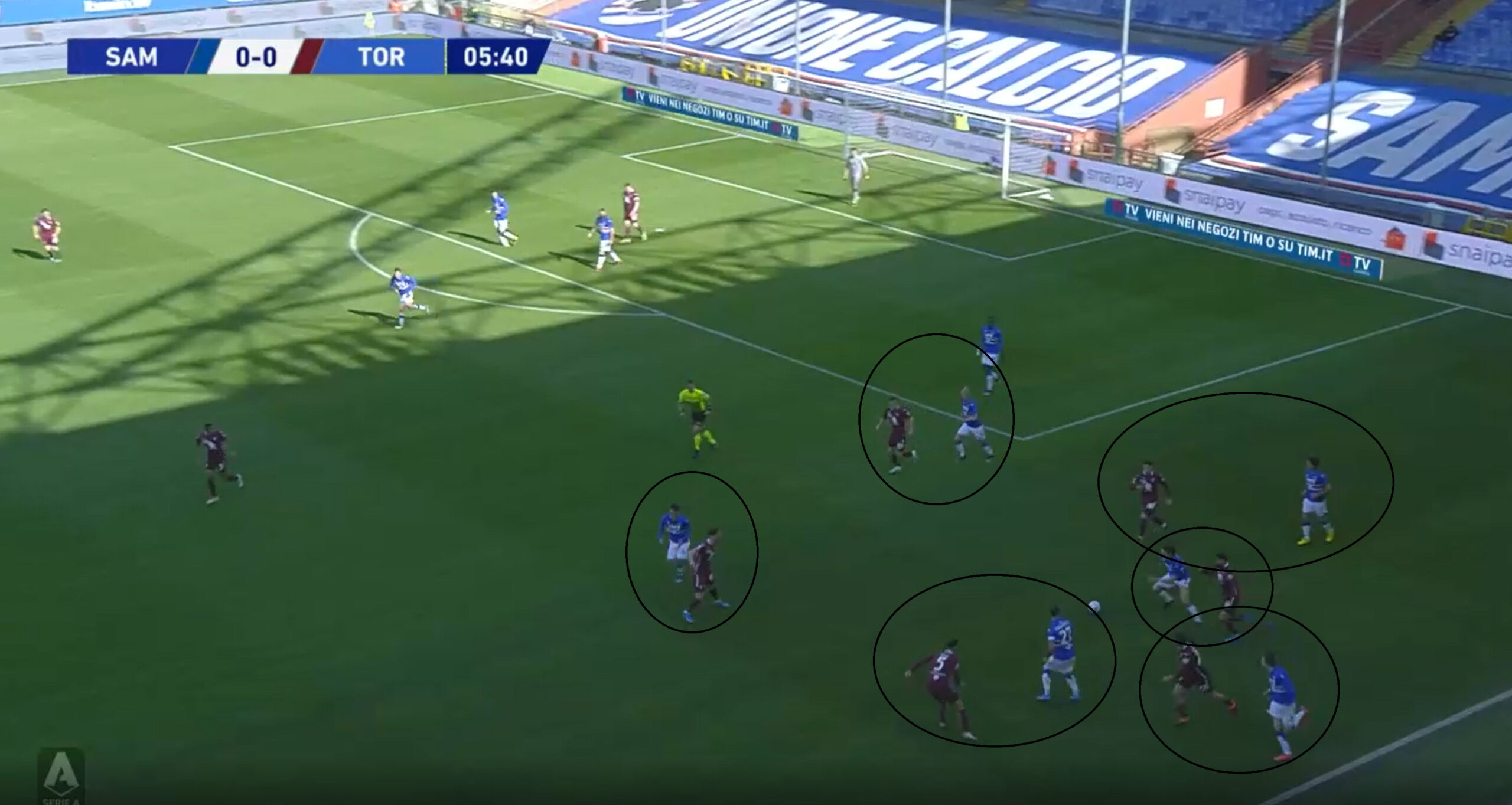 Con palla in movimento il Torino preferisce impostarsi con blocco medio mantenendo gli stessi principi, indirizzamento esterno e attacco dei riferimenti su palla chiusa laterale. Vediamo come nel match contro la Sampdoria i granata abbiano affrontato il 4-4-2 blucerchiato portando la mezzala di parte su terzino, vediamo inoltre come in fase di non possesso i granata stringano molto su lato palla privilegiando la chiusura delle linee di passaggio corte.