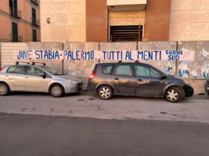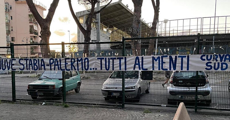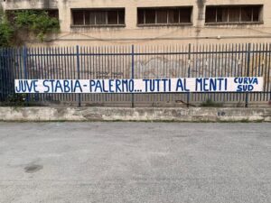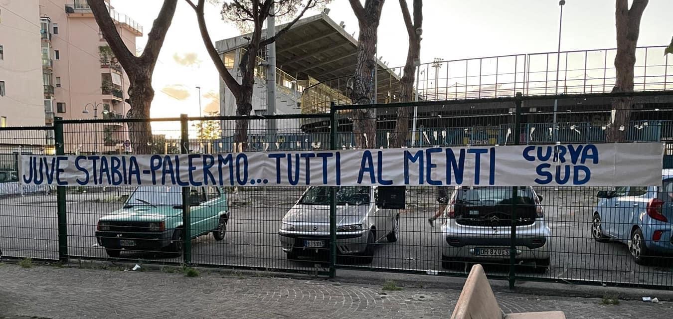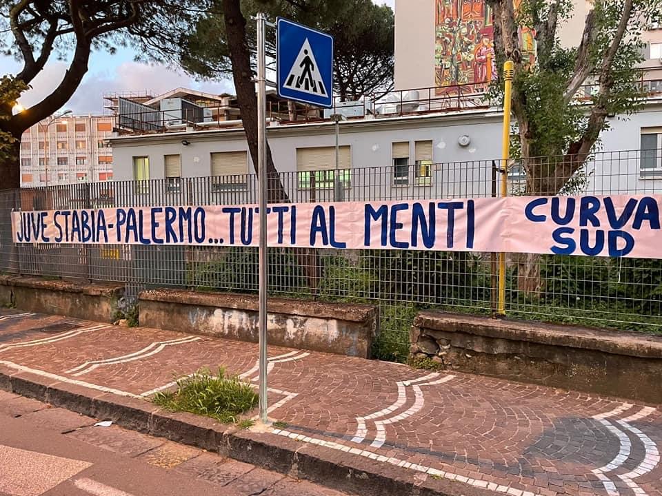 Proprio a margine della cruciale gara contro il Palermo, la tifoseria stabiese ancora una volta ha deciso di rispondere presente a modo suo, ossia, manifestando il grande amore per i colori gialloblù. I supporter delle vespe, appartenenti alla storica Curva Sud, hanno voluto caricare l’ambiente ma sopratutto la squadra di Pasquale Padalino tappezzando la città con diversi striscioni che recitano questa frase: “Juve Stabia-Palermo…Tutti al Menti”. La Curva Sud chiama a raccolta l’intero popolo stabiese in vista della delicatissima gara play-off di mercoledì. La stessa tifoseria, in occasione della precedente sfida con la Casertana, aveva spinto la formazione di Padalino dall’esterno dello stadio fino al triplice fischio per poi festeggiare l’approdo alla fase successiva con squadra e dirigenza.