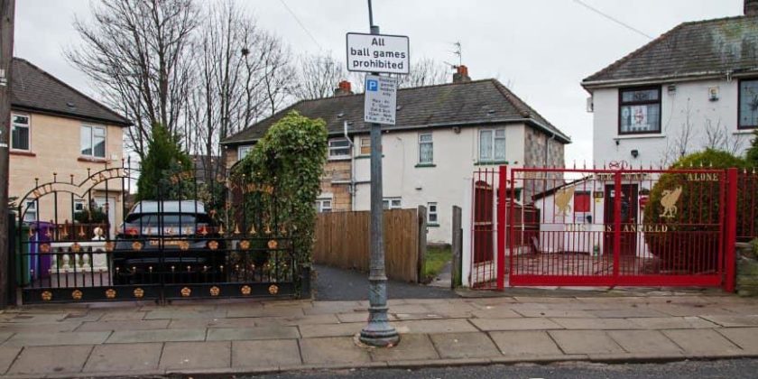 Nella periferia di Liverpool, città nota per la succitata passione per il calcio, due vicini di casa hanno voluto chiarire a tutto il vicinato la propria fede calcistica in un modo sui generis. Due abitazioni e due cancelli, proprio l’ingresso dei questi cancelli è decisamente particolare. Su di uno, quello rosso, troviamo la scritta You’ll Never Walk Alone, chiaro riferimento ai Reds, mentre sull’altro il motto dei Toffies, Nil Satis Nisi Optimum.