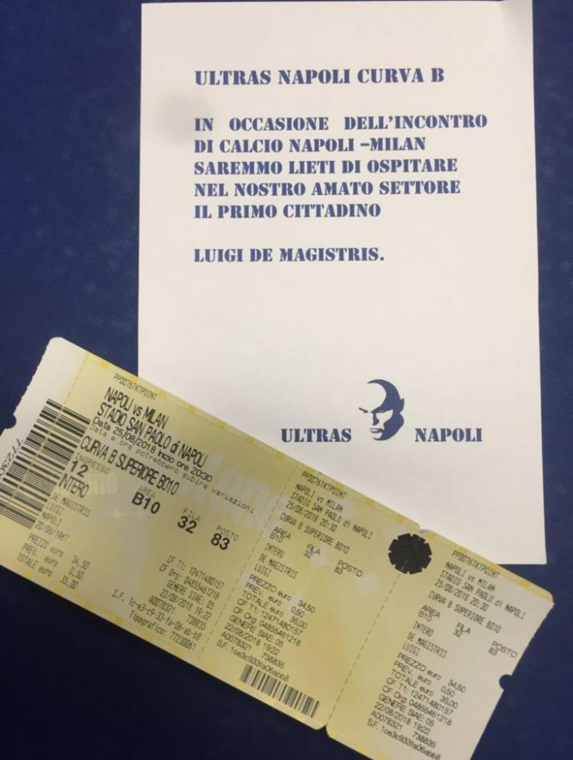 Il sindaco della città di Napoli, Luigi De Magistris, dopo l’invito ricevuto dagli ultras azzurri della curva B, ha emanato questo post sulla propria pagina Facebook: Ringrazio di cuore gli ultras della curva B dell’invito per la partita Napoli-Milan. Sono stato abbonato in curva B dal 1984 al 1990, da quando nel luglio del 1984 il Napoli acquisto’ Maradona. Purtroppo sabato sono fuori Napoli, ma sarò in curva con voi per la prossima partita in casa con la Fiorentina. Del resto dopo i reiterati ed offensivi attacchi alla Città e ai napoletani ho deciso di non sedermi più accanto ad Aurelio De Laurentiis. Forza Napoli sempre, città e squadra! Sono nato a Napoli, sono napoletano fino al midollo, sono tifoso del Napoli e sono stato eletto per due volte Sindaco di Napoli. Amo Napoli oltre la mia vita! A presto, in curva B! Grazie.
