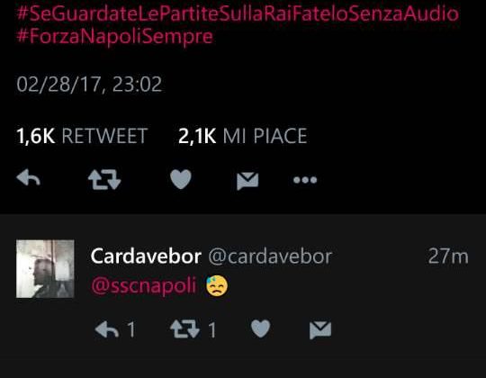 Appena dopo il triplice fischio finale nella partita di Juventus-Napoli, valevole per la sfida di andata nella Semifinale di Coppa Italia, il Napoli tramite un tweet sul proprio profilo ufficiale del noto social, ha commentato la telecronata RAI in modo polemico. Nello specifico la società azzurra ha creato l’hashtag #SeGuardateLePartitaSullaRaiToglieteLAudio, un commento che non è passato di certo inosservato e che già ieri sera ha ricevuto la replica del conduttore di “Zona11 pm” Marco Mazzocchi: ¬´Voglio chiarire che la regia non è nostra, ma di Infront, quindi arrabbiatevi con gli altri. Cos√¨ come Giuntoli ha definito vergognosa la direzione arbitrale, io invito la società sportiva calcio Napoli a tornare sui propri passi. E’ inaccettabile un attacco ai nostri telecronisti. Lo possono fare i tifosi, non la società e se ne assumerà la responsabilitପ.