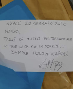 A provare subito a confortare il tifosissimo degli azzurri, è stato il capitano del Napoli, Lorenzo Insigne. L’esterno dei partenopei, tramite suo fratello Marco, con un video messaggio diffuso su Instagram giorni fa ci ha messo la faccia, scusandosi in prima persona delle ultime prove, ma sopratutto della sconfitta ottenuta con la Fiorentina che ha causato al piccolo napoletano una profonda delusine: Ciao Mario! Ti voglio fare tanti auguri di buon onomastico. Mi dispiace che per il risultato ti sei messo a piangere. Ti promettiamo che da qui alla fine faremo un grande campionato e tornerai a sorridere con noi! Ti aspettiamo allo Stadio, un abbraccio!”.
