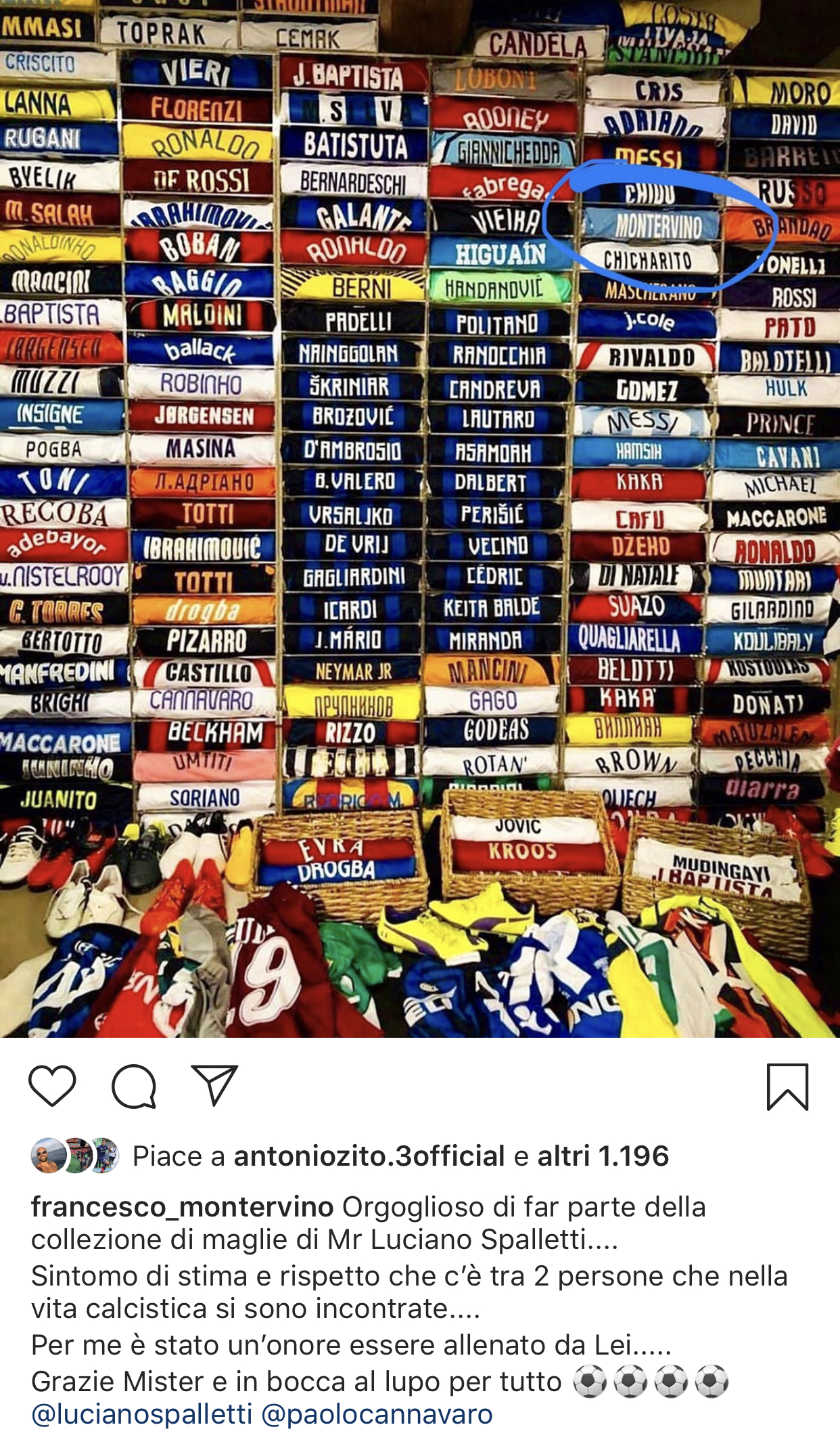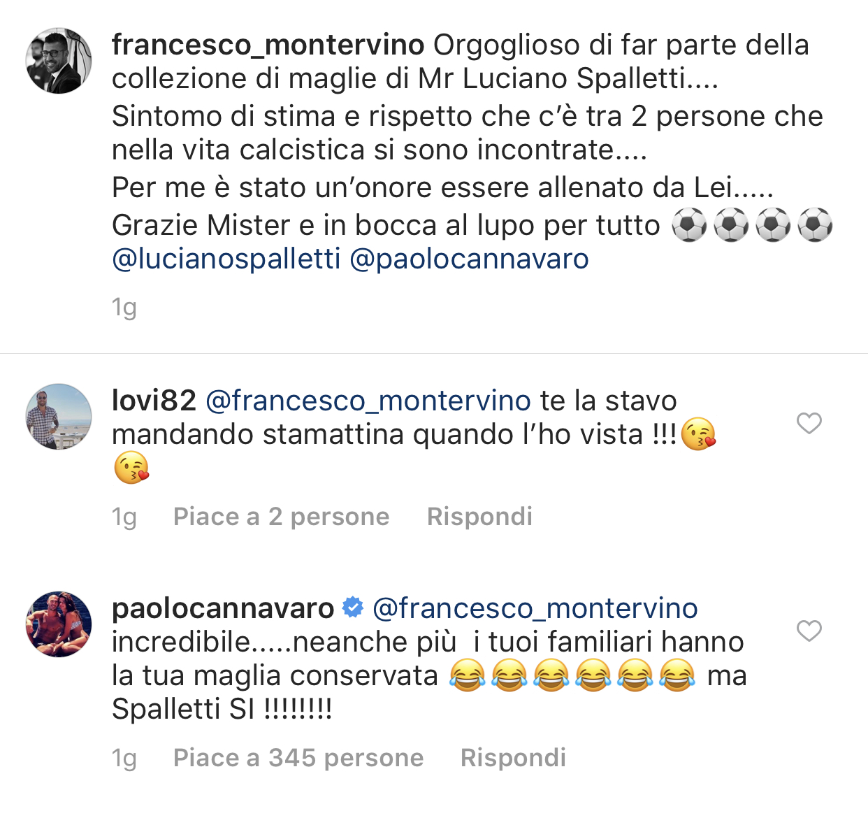 Nel post Montervino tagga anche Poalo Cannavaro. La risposta dell’ex difensore dei partenopei non si fa attendere. Infatti, in modo scherzoso Cannavaro esprime la propria opinione sulla collezione di mister Luciano Spalletti, schernendo però lo stesso Montervino: Incredibile, neanche più i tuoi familiari hanno la tua maglia conservata, ma Spalletti s√¨.