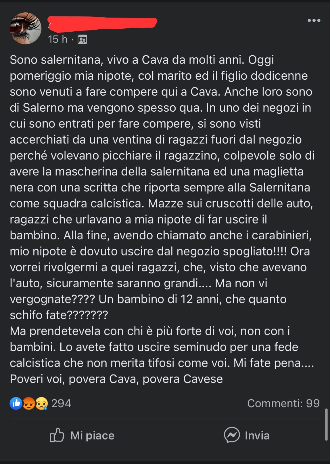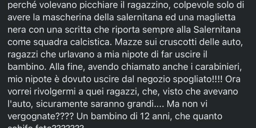 Alla fine, avendo chiamato anche i carabinieri, mio nipote è dovuto uscire dal negozio spogliato!!!! Ora vorrei rivolgermi a quei ragazzi, che, visto che avevano l’auto, sicuramente saranno grandi…. Ma non vi vergognate???? Un bambino di 12 anni, che quanto schifo fate??????? Ma prendetevela con chi è più forte di voi, non con i bambini. Lo avete fatto uscire seminudo per una fede calcistica che non merita tifosi come voi. Mi fate pena…. Poveri voi, povera Cava, povera Cavese”.