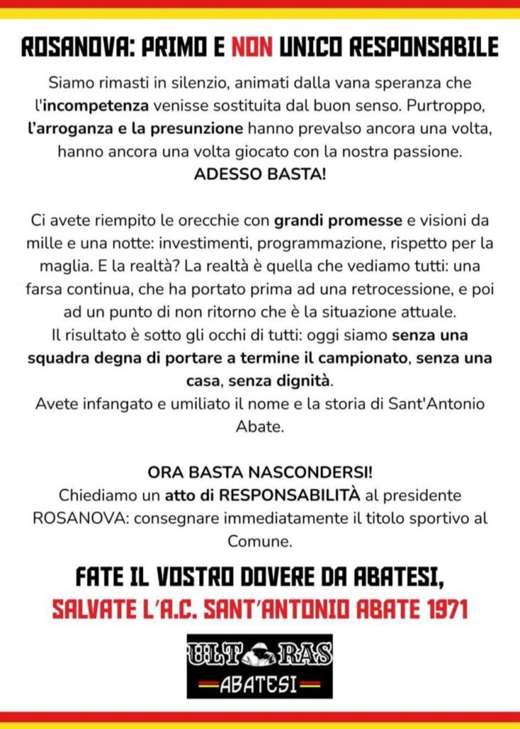 Nelle scorse ore, gli Ultras Abatesi hanno diffuso un duro volantino contro la società e in particolare contro il presidente Rosanova, accusato di aver trascinato il club nel caos tecnico e organizzativo. Nel comunicato si parla di arroganza, presunzione e incompetenza, oltre a “promesse mai mantenute” e “farsa continua” che avrebbe portato prima alla retrocessione e poi al crollo attuale.