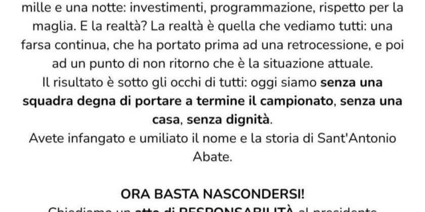 Nel frattempo, il Sant’Antonio Abate resta ultimo, con la tifoseria che chiede una svolta immediata. Il futuro del club non dipende solo dai risultati del campo, ma dalla capacità di ritrovare unità, trasparenza e identità. Prima che sia davvero troppo tardi.